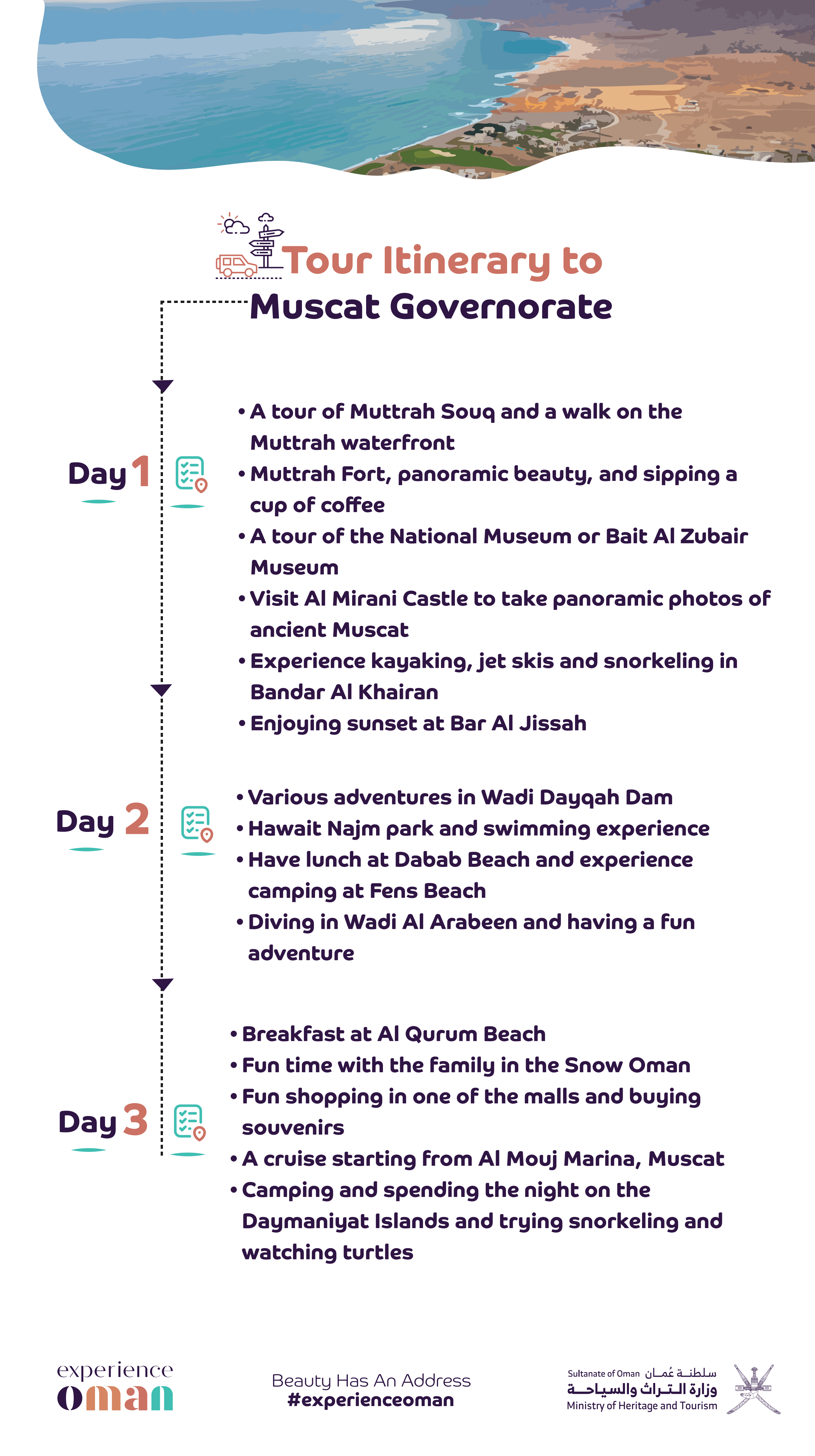 On this page, we provide you with a comprehensive guide to the most prominent suggested tourist programs in Muscat Governorate, carefully designed to ensure you have a unique and exciting travel experience. Whether you are an adventure enthusiast or looking for cultural exploration trips, you will find everything you need to plan your perfect trip here. You can also download the tourist program file for each area to facilitate planning and make the most of your journey. We are always updating this page with more tourist programs and recreational activities, so we recommend following us to stay updated on everything new in the world of tourism in Muscat.